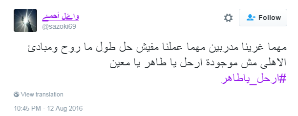 وشارك جماهير النادى الأهلى من خلال الهاتشتاج، فقال وائل أحمد:”مهما جربنا مدربين مهما عملنا مفيش حل طول ما روح ومبادئ الاهلى مش موجودة ارحل يا طاهر يا معين”، كما قال وائل منتصر:”إدارة الأهلى الفاشلة رفضت جوزيه لأنه عجوز وكبير في السن .. مجرد ذكر السبب دا فى حد ذاته من رئيس نادى كان لازم يمشى بعدها فوراً”.