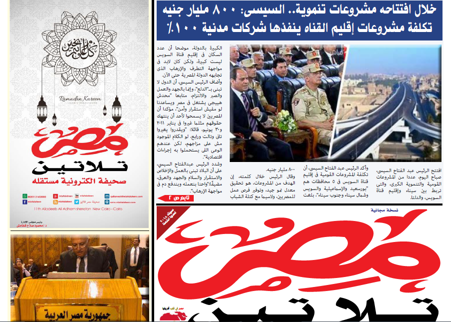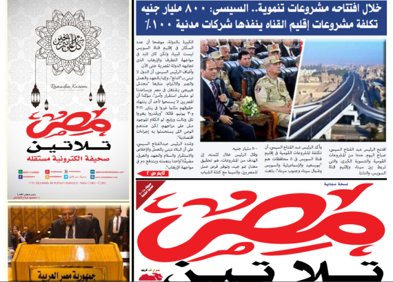 تقدم صحيفة مصر تلاتين عدد اسبوعي يصدر عن الصحيفة كل يوم خميس نستعرض فيه ونوثق أهم أحداث الاسبوع على المستوى المحلي والعالمي .