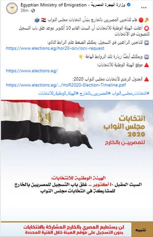 ووجهت الوزارة فى بيان، اليوم، الناخبين من المصريين بالخارج بضرورة التسجيل على موقع الهيئة الوطنية للانتخابات، قبل موعد غلق باب التسجيل للتصويت في الانتخابات السبت المقبل، موضحة “أنه لن يتكمن المواطن بالخارج من المشاركة بالانتخابات بدون التسجيل على موقع الهيئة خلال الفترة المحددة”.