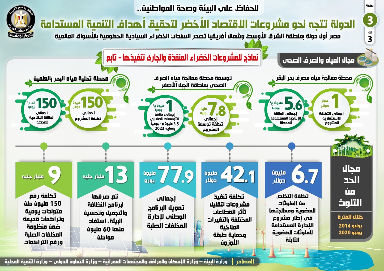 نشر المركز الإعلامي لمجلس الوزراء، تقريراً شمل إنفوجرافات تسلط الضوء على اتجاه الدولة نحو مشروعات الاقتصاد الأخضر؛ للحفاظ على البيئة وصحة المواطنين.
