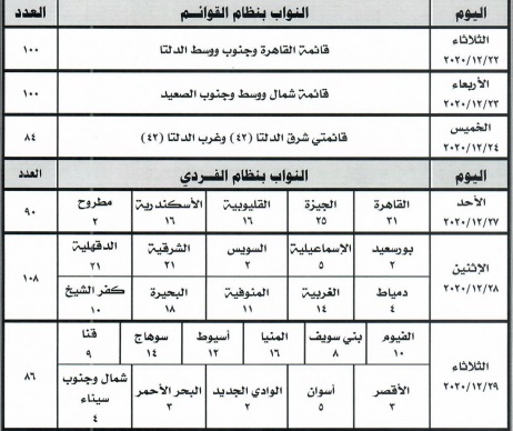 – الاحد 27 ديسمبر: نواب (5) محافظات (القاهرة ،الجيزة، القليوبية ،الاسكندرية ، مرسى مطروح.) بإجمالي عدد ٩٠ نائب.