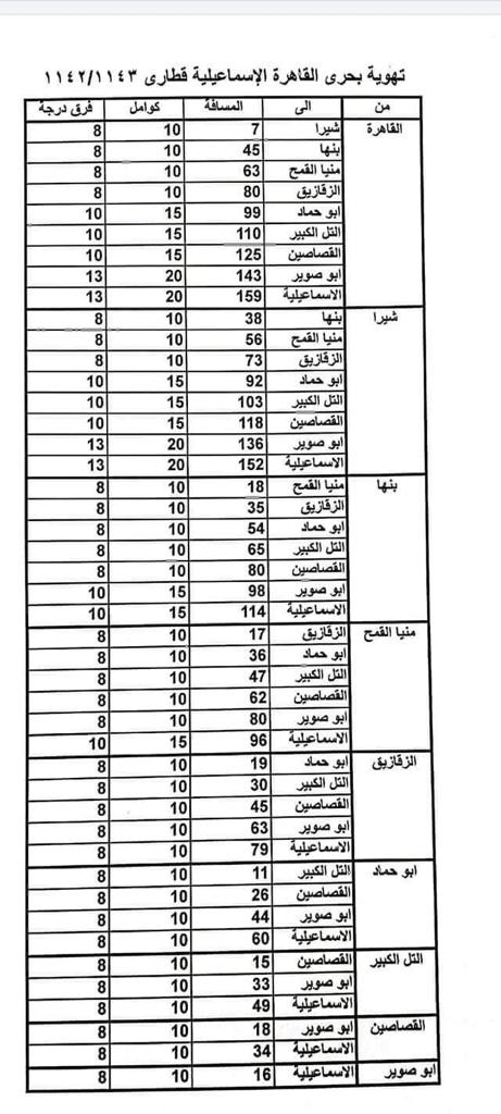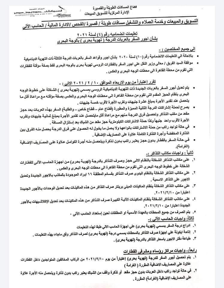 قررت الهيئة القومية لسكك حديد مصر، تعديل أسعار تذاكر القطارات الروسية ذات التهوية الديناميكية بنظام الحجز للوجه البحري (قطاري 1142 و1143)، بصفة مؤقتة بداية من غد الأربعاء، على أن يكون أقل الحد الأدنى للتذكرة 10 جنيهات.