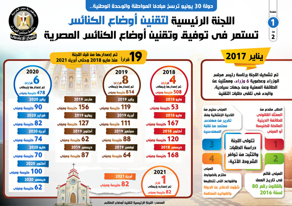 نشر المركز الإعلامي لمجلس الوزراء، تقريراً تضمن إنفوجرافات تسلط الضوء على استمرار اللجنة الرئيسية لتقنين أوضاع الكنائس في توفيق وتقنين أوضاع الكنائس المصرية .