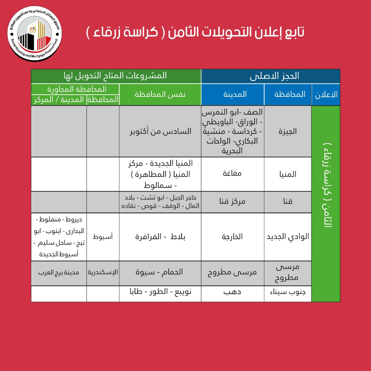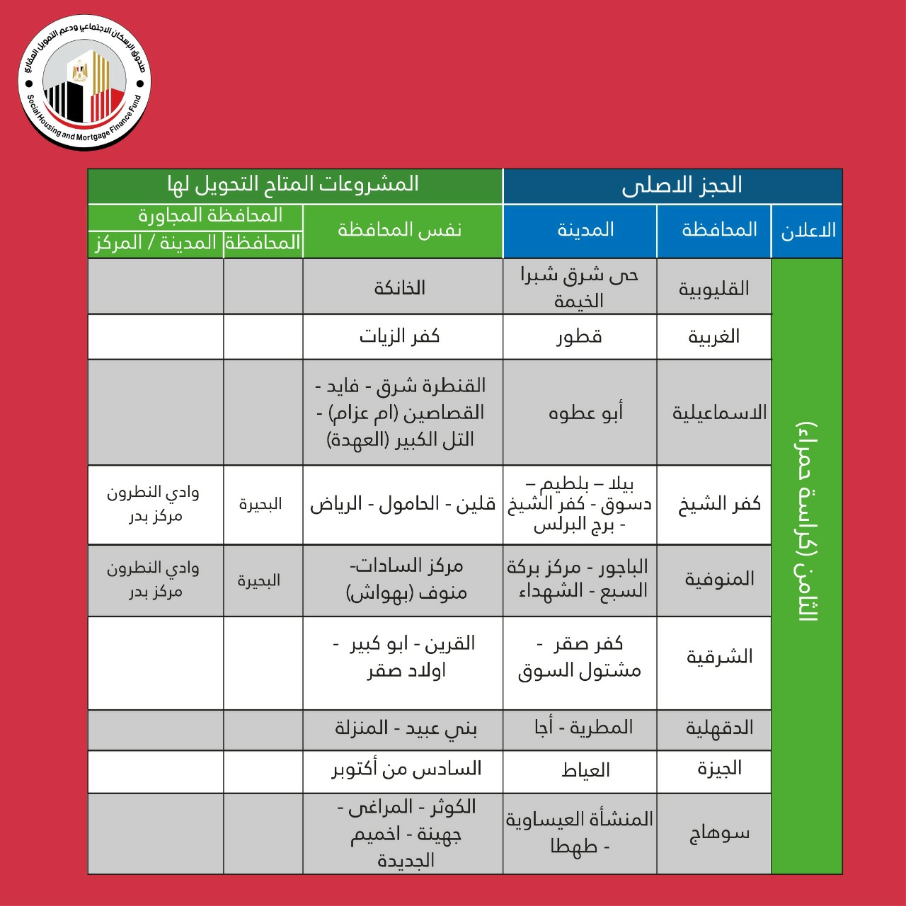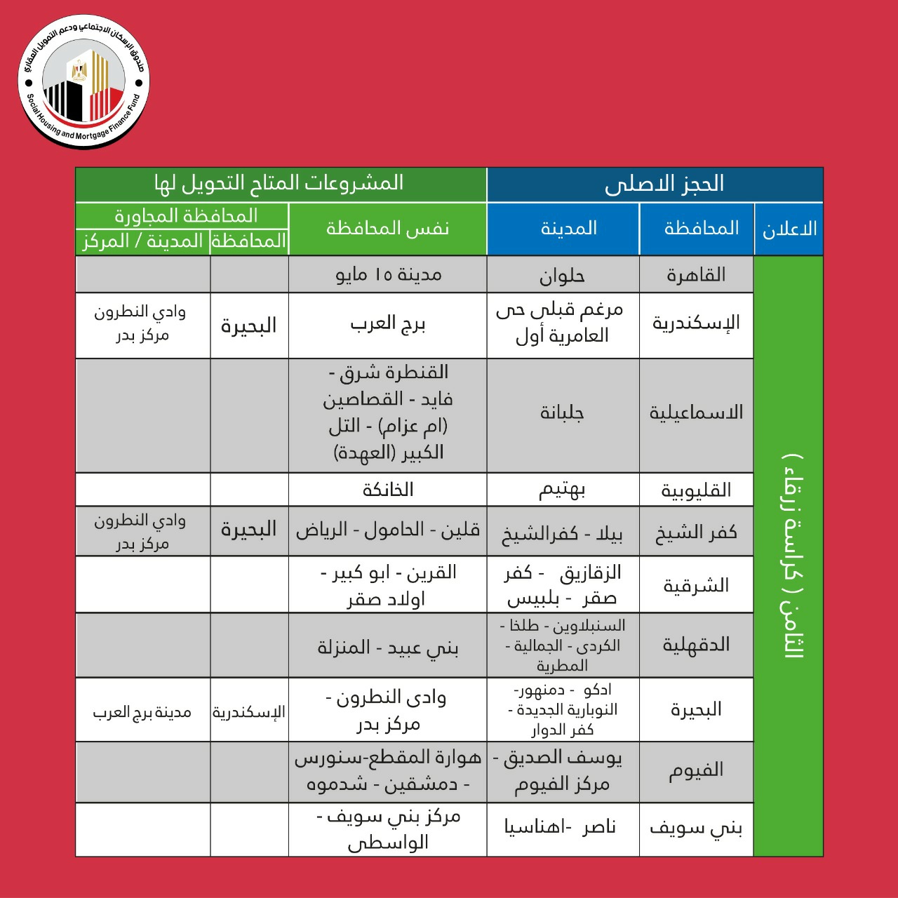 وذكر أن التحويل يكون إلى المشروعات المتوافر بها فائض وحدات، على أن تكون الوحدة بنفس السعر (سواء داخل نطاق المحافظة أو محافظة مجاورة للمحافظة المُتقدم عليها) بشرط انطباق شروط الحجز عليهم.
