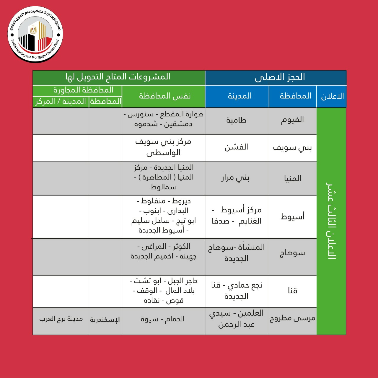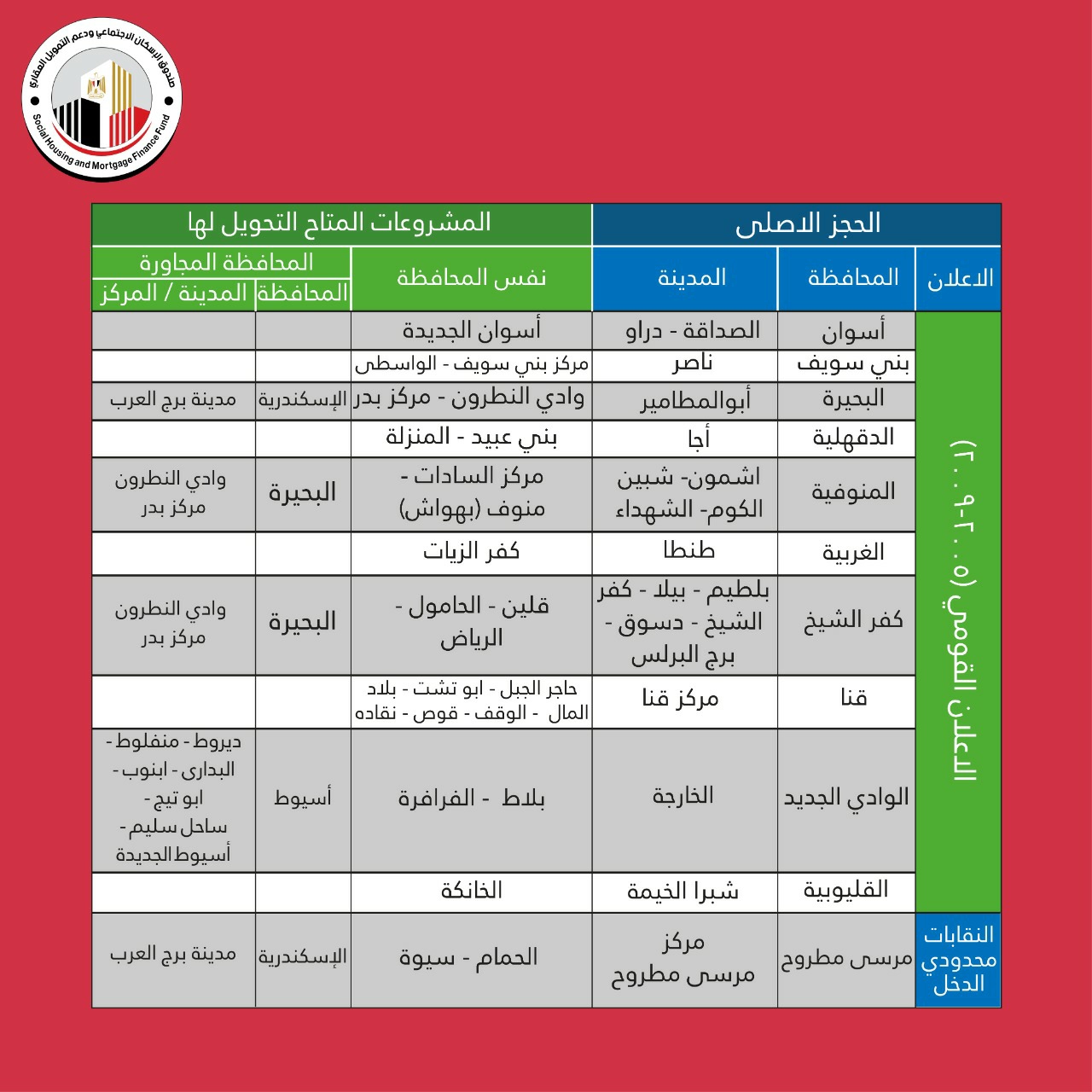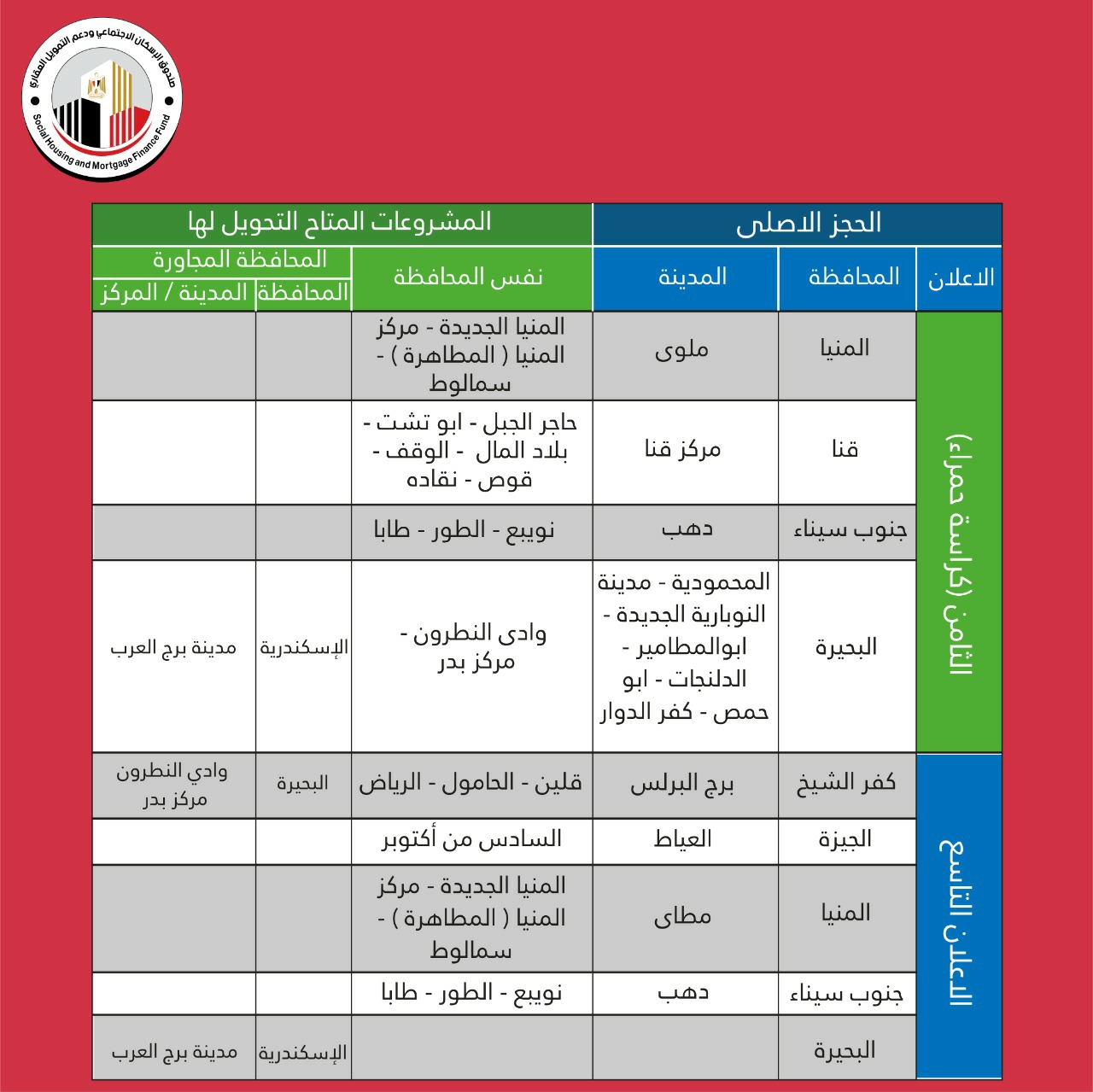 وذكر أن التحويل يكون إلى المشروعات المتوافر بها فائض وحدات، على أن تكون الوحدة بنفس السعر (سواء داخل نطاق المحافظة أو محافظة مجاورة للمحافظة المُتقدم عليها) بشرط انطباق شروط الحجز عليهم.