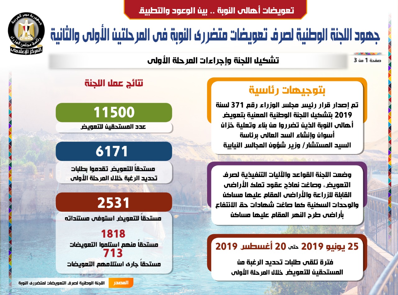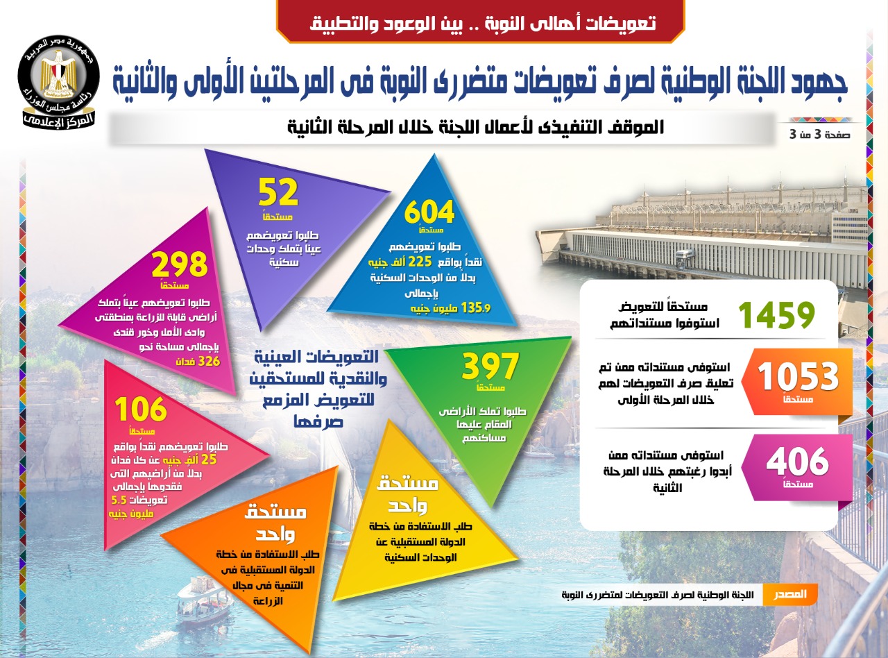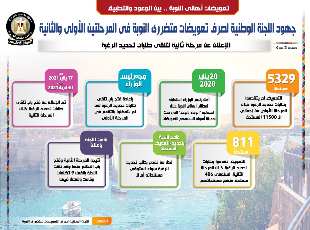 نشر المركز الإعلامي لمجلس الوزراء، تقريراً تضمن إنفوجرافات تسلط الضوء على جهود اللجنة الوطنية لصرف تعويضات متضرري النوبة في المرحلتين الأولى والثانية.