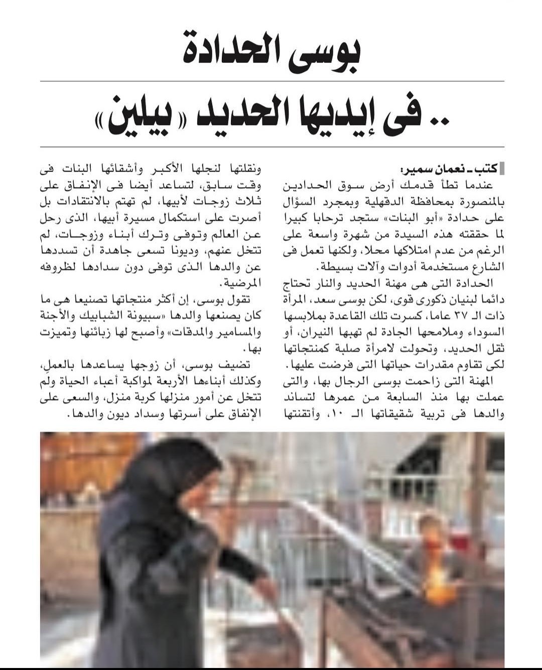 وكانت نشرت جريدة الشروق فى فترة سابقة فى ٢٣/٣/٢٠١٩ فى الصفحة الأخيرة نشر تقريرًا، تحت عنوان بوسى فايدها الحديد بيلين حيث عملها كأنثى فى مهنة الحدادة كأول حدادة بالمنصورة تطوع الحديد منذ كانت فى عمر السابعة ضحت بطفولتها وشبابها لتعين والدها على الحدادة.