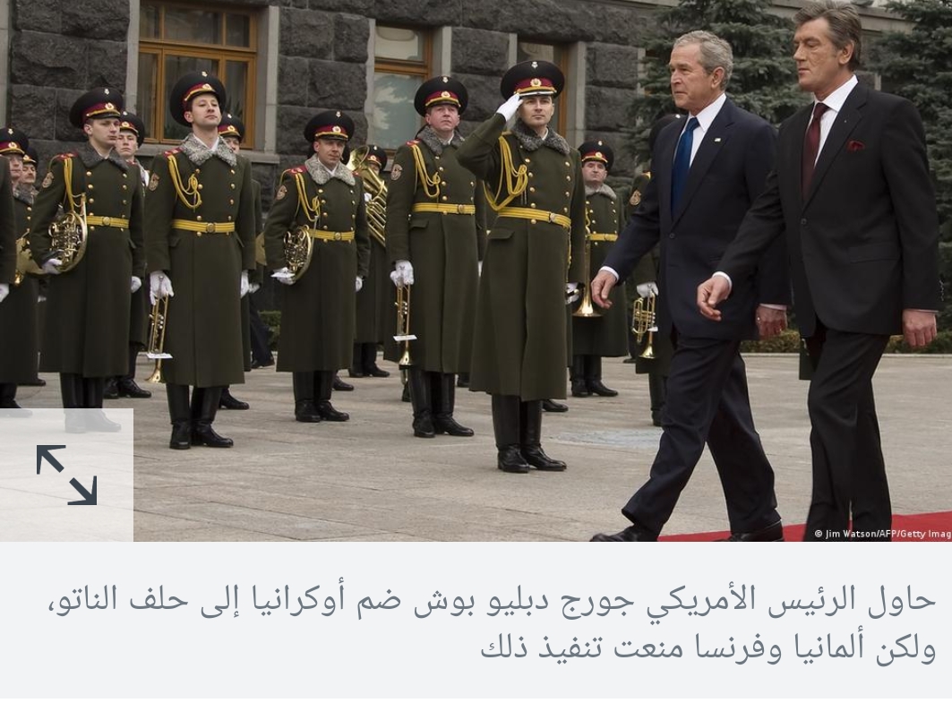 وفي عام 2008، حاول الرئيس الأمريكي آنذاك، جورج دبليو بوش، إدماج أوكرانيا وجورجيا في حلف شمال الأطلسي (ناتو)، وقبول عضويتهما من خلال برنامج تحضيري. قوبل ذلك باحتجاج بوتين، وموسكو أعلنت بشكل واضح أنها لن تقبل الاستقلال التام لأوكرانيا. فرنسا وألمانيا حالتا دون تنفيذ بوش لخطته. أثناء قمة الناتو في بوخارست تم طرح مسألة عضوية أوكرانيا وجورجيا، ولكن لم يتم تحديد موعد لذلك.
