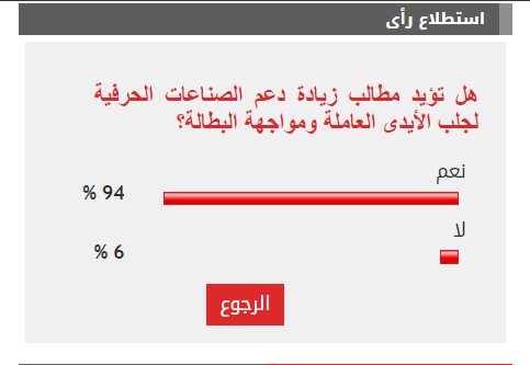 وأيد 94% من القراء مطالب زيادة دعم الصناعات الحرفية لجلب الأيدى العاملة ومواجهة البطالة، بينما رفض 4% موضوع الاستطلاع.