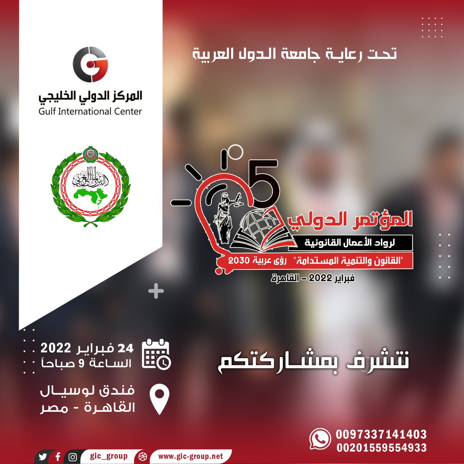 يطلق المركز الدولي الخليجي النسخة الخامسة من المؤتمر الدولي لرواد الأعمال القانونية تحت عنوان “القانون & التنمية المستدامة” رؤى عربية 2030، في 24 فبراير الجاري بفندق لوسيال بالعاصمة المصرية القاهرة.