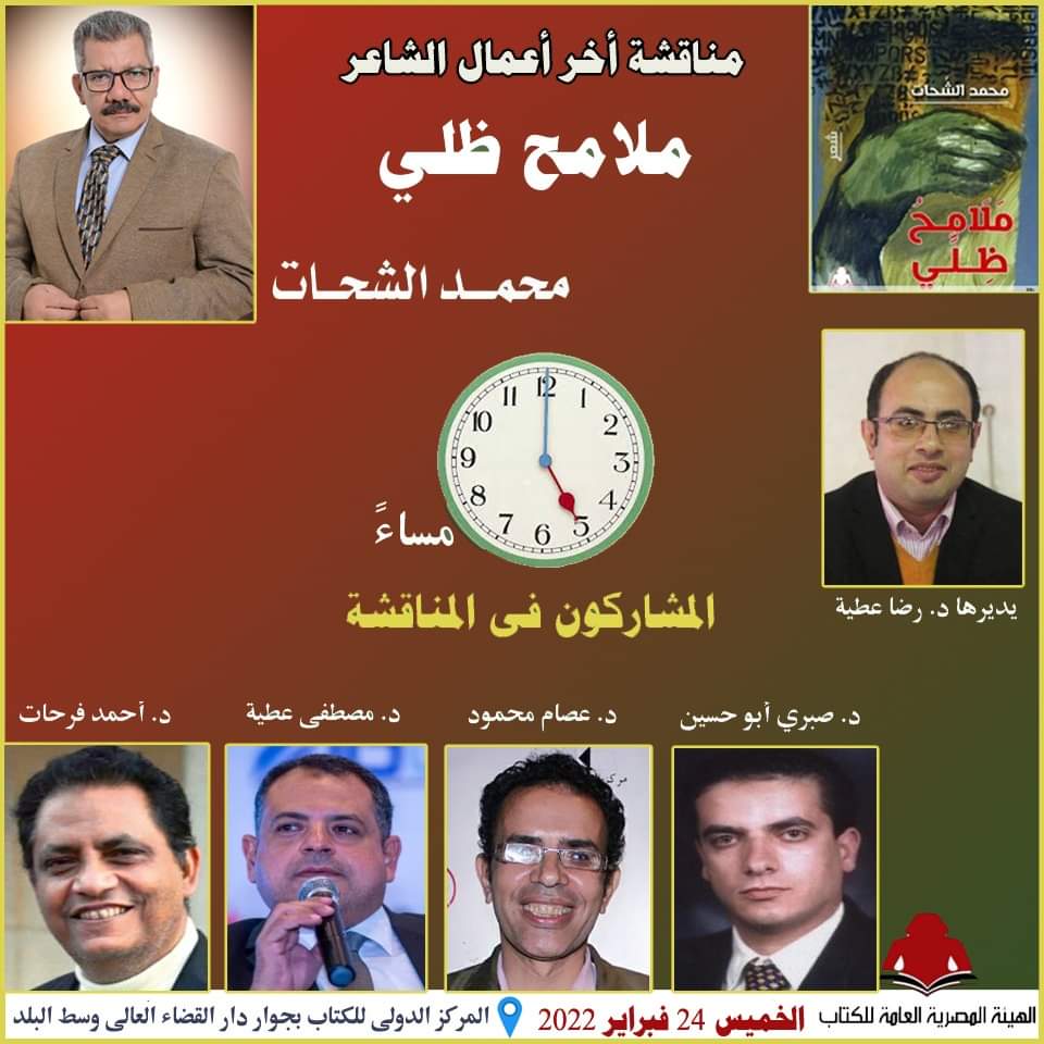 يلتف خمسه من نقاد الادب حول ظل الشاعر محمد الشحات في الخامسة مساء الخميس ٢٤ فبراير بالمركز الدولي للكتاب بالهيئة المصرية العامة للكتاب برئاسة د. هيثم الحاج لمناقشة ديوان “ملامح ظلي” الصادر عن الهيئة المصرية العامة للكتاب مؤخرا.