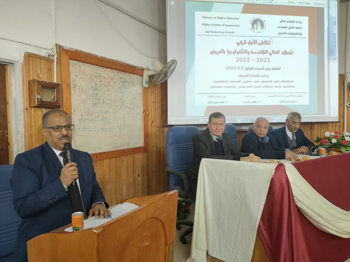 افتتح الملتقي عميد المعهد الاستاذ الدكتور كمال مراد عميد المعهد والذي رحب فيها بكافة الحضور من الطلاب ورموز المجتمع والقيادات النقابيه والتعليميه مؤكدا علي شكره لمحافظ شمال سيناء واعضاء الهيئه البرلمانيه علي دعم كافة انشطه ومبادرات المعهد بما يكفل دعم ابناء المعهد