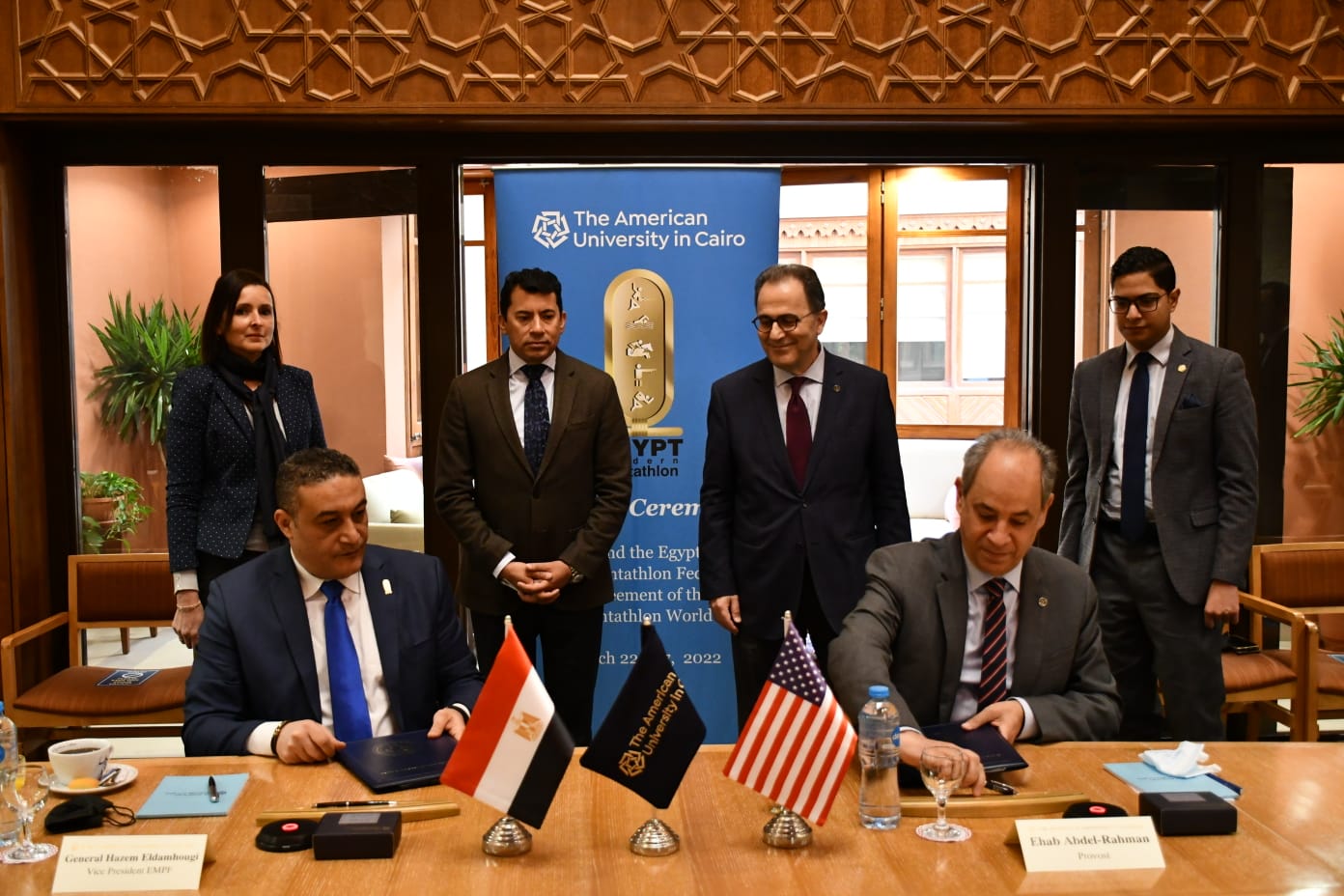 شهد الدكتور أشرف صبحي وزير الشباب والرياضة، والدكتور أحمد دلال رئيس الجامعة الأمريكية بالقاهرة، مراسم توقيع بروتوكول بين الجامعة الأمريكية بالقاهرة والإتحاد المصري للخماسي الحديث، لاستضافة مصر لبطولة كأس العالم للخماسي الحديث على ملاعب الجامعه الأمريكية بالقاهرة الجديدة.