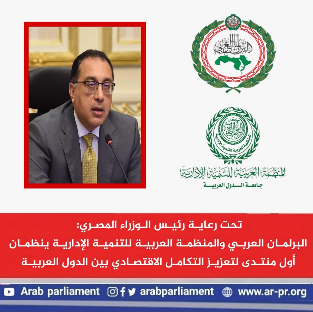 تحت رعاية معالي دولة رئيس مجلس الوزراء المصري الدكتور مصطفى مدبولي ، وبحضور عربي رفيع المستوى ، ينظم البرلمان العربي بالتعاون مع المنظمة العربية للتنمية الإدارية ، منتدى تعزيز التكامل الاقتصادي بين الدول العربية: “التجارة البينية ودور القطاع العام والخاص في تحقيق ذلك” ، وذلك خلال الفترة من 23 إلى 25 مايو الجاري 2022م بجمهورية مصر العربية .