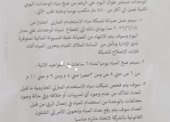 وتناول الخطاب في البند الأول أنه سيتم عمل صيانة بداية من 15 يونيو الجاري وسيتم قطع المياة علي مدار اليوم وسيتم الأنتهاء من هذه الصيانه طبقا (للسيولة المالية المتوفرة) وذلك البند الذي تم صياغته بغباء شديد يدين الأدارة الغبية بأنها لا تحمل نية طيبة في الأصلاح ..ثم جاء أيضا في الخطاب ( تأمل الأدارة من الملاك تخزين المياة أثناء فترات الأصلاح وذلك التعامل علي أن الملاك ( جمل ) يكتر المياه في هذه الصحراء الجرداء ويخزنها أو يفترضون أن جميع الملاك لديهم خزانات ومن لا يملك خزان فليضرب برأسة عرض الحائط ..أو يلجأ لأحد السماسرة العاملين بالأدارة لكي يقوم بعمل خزان له مقابل الحصول علي ( المعلوم ) .