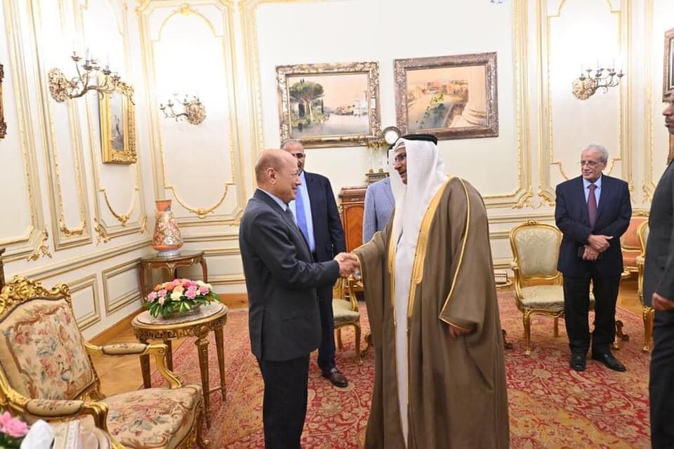استقبل الرئيس الدكتور رشاد محمد العليمي، في مقر إقامته بقصر القبة في العاصمة المصرية القاهرة عادل بن عبدالرحمن العسومي، رئيس البرلمان العربي، وذلك بحضور عضوي مجلس القيادة الرئاسي عيدروس الزبيدي، وسلطان العرادة.