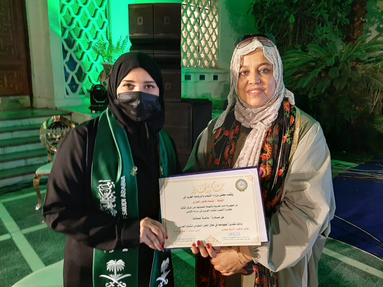 فوز السعوديه ابتسام العنزي بجائره التميز للشباب العربي 2022 من جامعه الدول العربية