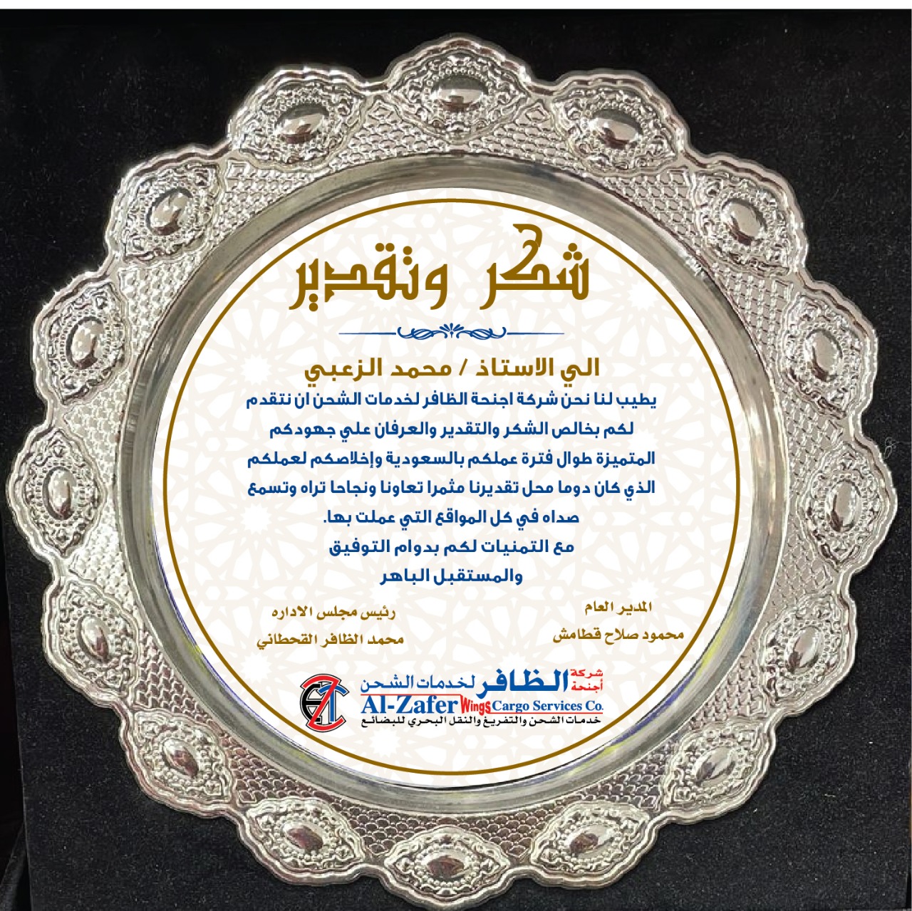 اقيم بجده حفل وداعي بسيط للاستاذ محمد الزعبي بمناسبه سفره الي بلاده وقد حرصت شركه اجنحه الظافر لخدمات الشحن علي تكريم الاستاذ/ محمد الزعبي تقديرا لسنوات خدمته بالمملكه وما قدمه طوال فتره عمله حيث كان مشهودا له بالكفاءة والامانه وقد قام السيد / محمود صلاح قطامش مدير عام شركه اجنحه الظافر لخدمات الشحن ونيابة عن الشيخ / محمد الظافر رئيس مجلس الاداره بتقديم الدرع التذكاري للاستاذ محمد الزعبي متمنيا له دوام التوفيق والتقدم والمستقبل الباهر وذلك بحضور الاستاذ محمد السعيد المدير العام باحدي الشركات الملاحية وعضو لجنه الوكلاء الملاحيين بالغرفه التجاريه .
