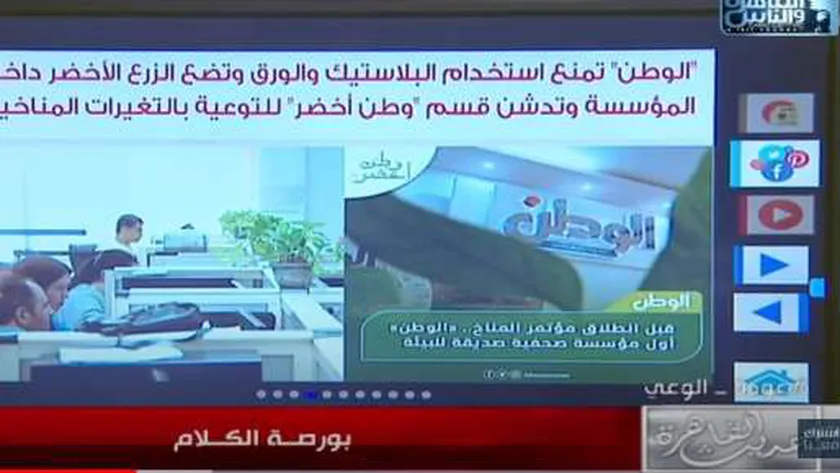 سلط برنامج «حديث القاهرة»، الذي يقدمه الإعلامي خيري رمضان، والإعلامية كريمة عوض، المذاع على شاشة «القاهرة والناس»، الضوء على ما قامت به جريدة «الوطن»، كأول مؤسسة صحفية صديقة للبيئة، بمنعها استخدام المواد البلاستيكية والورقية، ووضع الزرع الأخضر في مختلف جنباتها، إضافة إلى ترشيد استهلاك الطاقة لأقل مستوى ممكن: «المبادرة راقية»، وذلك خلال فقرة «بورصة الكلام»، الذي قدمها الإعلامي خالد البرماوي.