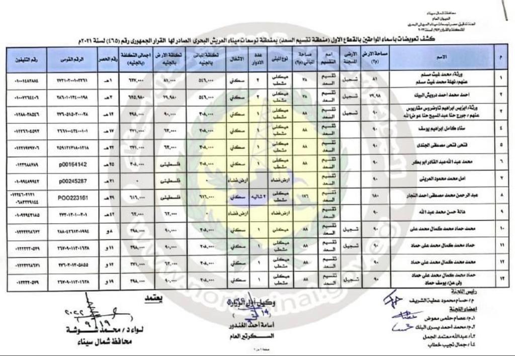 وكانت محافظة شمال سيناء أعلنت فى وقت سابق على صرف التعويضات اللازمة لكافة أصحاب المنازل التي سيتم إزالتها لصالح المشروع، قبل البدء في إخلاء المنطقة، وتشمل التعويضات عدة بدائل من بينها حصول المواطن على تعويض مادي عادل عن سعر الأرض والمبنى، أو الحصول على وحدات سكنية بديلة توفرها المحافظة بمنطقة الريسة أو قطعة أرض بمساحات 120 مترًا بمنطقة الريسة.