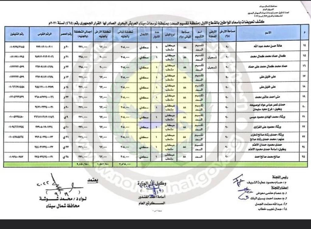 أعلنت محافظة شمال سيناء عن بدء صرف تعويضات المرحلة الأولى بمنطقة شاليهات السعد توسعات الميناء البحري بمدينة العريش بعد البدء فى تنفيذ المرحلة الأولى.