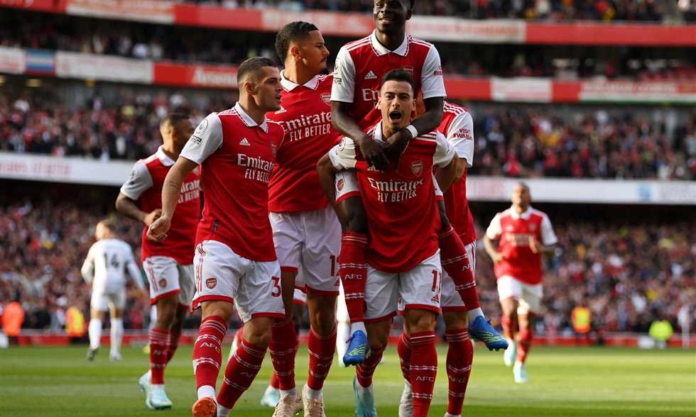 لاعبو أرسنال يحتفلون بهدف جابريال مارتينيلي في ليفربو