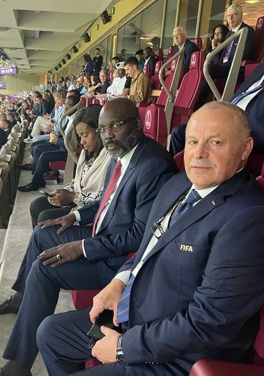 الرئيس الليبيري بصحبة أبو ريدة في مباراة أمريكا وإنجلترا بكأس العالم