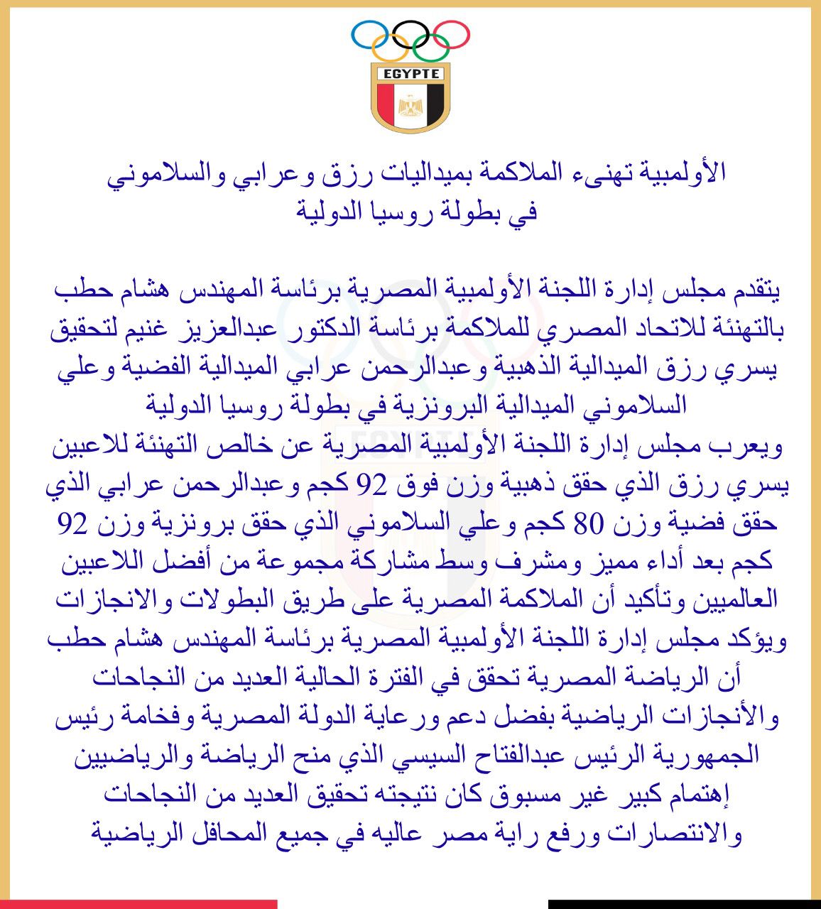 يتقدم مجلس إدارة اللجنة الأولمبية المصرية برئاسة المهندس هشام حطب بالتهنئة للاتحاد المصري للملاكمة برئاسة الدكتور عبدالعزيز غنيم لتحقيق يسري رزق الميدالية الذهبية وعبدالرحمن عرابي الميدالية الفضية وعلي السلاموني الميدالية البرونزية في بطولة روسيا الدولية.
