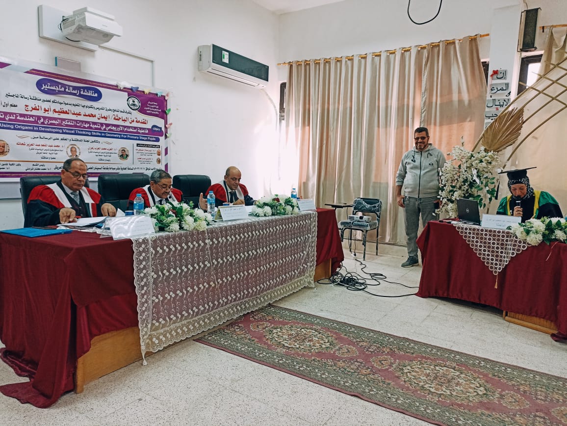 احتضنت قاعة السيمنار العلمي كلية التربيه بجامعة العريش مناقشة رسالة الماجستير المقدمه من الباحثه إيمان محمد عبد العظيم ابو الفرج معلم اول رياضيات بعنوان فعالية استخدام الاوريجامي في تنمية مهارات التفكير البصري في الهندسه لدي تلاميذ المرحله الابتدائيه