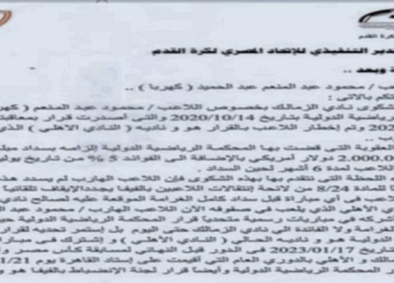 وننشر حصل نسخة من شكوى الزمالك ضد لاتحاد الكرة ضد كهربا والتي سيتم تحويلها للفيفا.