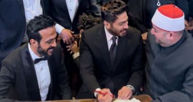 حرص الفنان تامر حسنى على تهنئة أحمد عصام بمناسبة زفافه أمس من خلال حسابه على موقع إنستجرام، وذلك عبر عدة صور نشرها من الحفل، وعلق عليها بكتابة: “مليار مبروك لحبيبي وصاحب عمري أحمد عصام والله كنت حاسس إني بجوز ابني، ربنا يكرمك يا حبيبي أنت ومراتك، وبالنسبة للصور الجميلة دي أظن مهما علقت مش هعرف أوصف جمال روحها وصدقها، عقبال الجميع”.