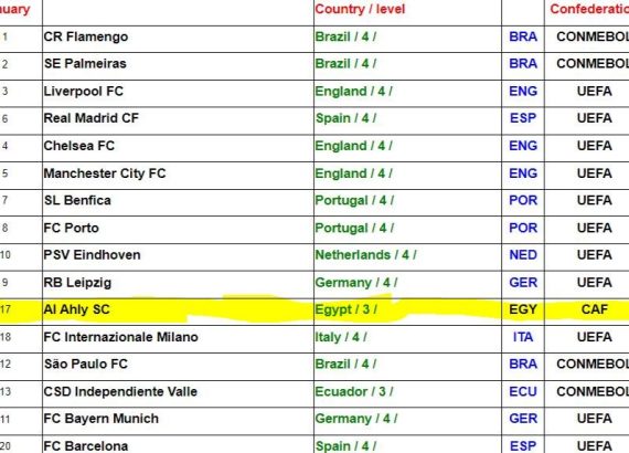 وتقدم النادي الأهلي في تصنيف الأندية حول العالم، خلال شهر فبراير ليحتل المركز الـ11 بدلاً من الـ17، كما احتل صدارة ترتيب الأندية عربيا وأفريقيا، ويمتلك المارد الأحمر في رصيده بالتصنيف 218.5 نقطة، متفوقا على برشلونة الإسباني وميلان الإيطالي وباريس سان جيرمان الفرنسي.