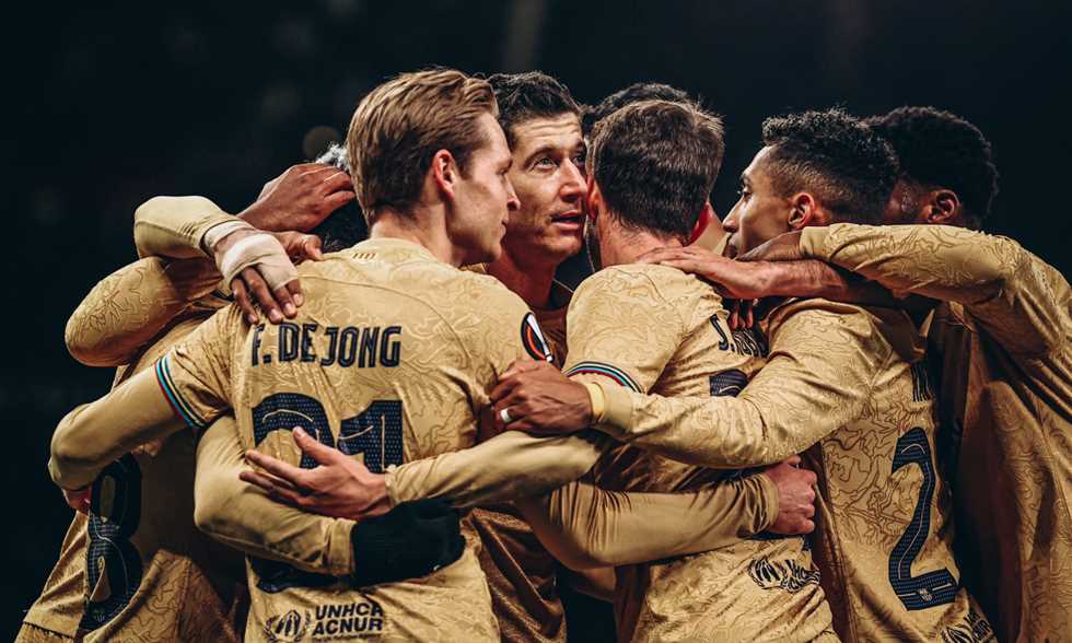 احتفال لاعبي برشلونة بهدف ليفاندوفسكي أمام مانشستر يونايتد