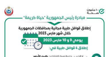 تطلق وزارة الصحة والسكان، اليوم وغدا ، 4 قوافل طبية ضمن مبادرة رئيس الجمهورية حياة كريمة للكشف والعلاج مجانًا فى التخصصات الطبية المختلفة.
