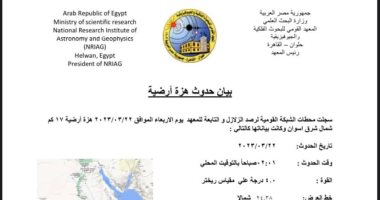وقالت الشبكة القومية للزلازل التابعة للمعهد القومي للبحوث الفلكية والجيوفيزيقية إن مركز الزلزال يقع في المنطقة 24.3863 درجة شمالا، 33.2318 درجة شرقا، بينما المكان: 19 كم أسوان، مصر، بينما المكان الرئيسي: 47 كم شمال شرق أسوان والعمق: 0.03 كيلو مترًا.