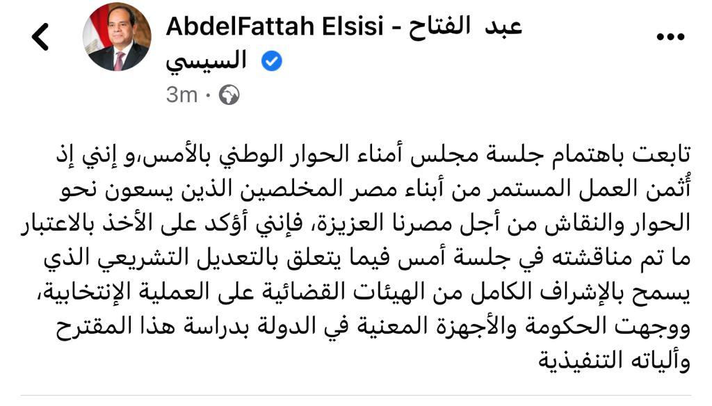 وقال الرئيس السيسى- عبر حساباته الرسمية بمواقع التواصل الاجتماعى-:” وإنني إذ أُثمن العمل المستمر من أبناء مصر المخلصين الذين يسعون نحو الحوار والنقاش من أجل مصرنا العزيزة، فإنني أؤكد على الأخذ بالاعتبار ما تم مناقشته في جلسة أمس فيما يتعلق بالتعديل التشريعي الذي يسمح بالإشراف الكامل من الهيئات القضائية على العملية الانتخابية، ووجهت الحكومة والأجهزة المعنية في الدولة بدراسة هذا المقترح وآلياته التنفيذية”