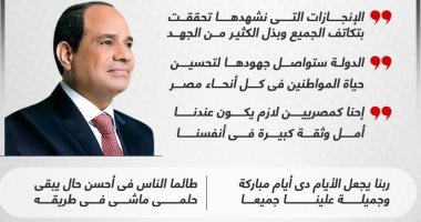 وتابع الرئيس السيسى :”ربنا يجعل الأيام ده أيام مباركة وجميلة علينا ، والصيام اللى بنصوموا مسلمين ومسيحيين شيء جميل جدا”.