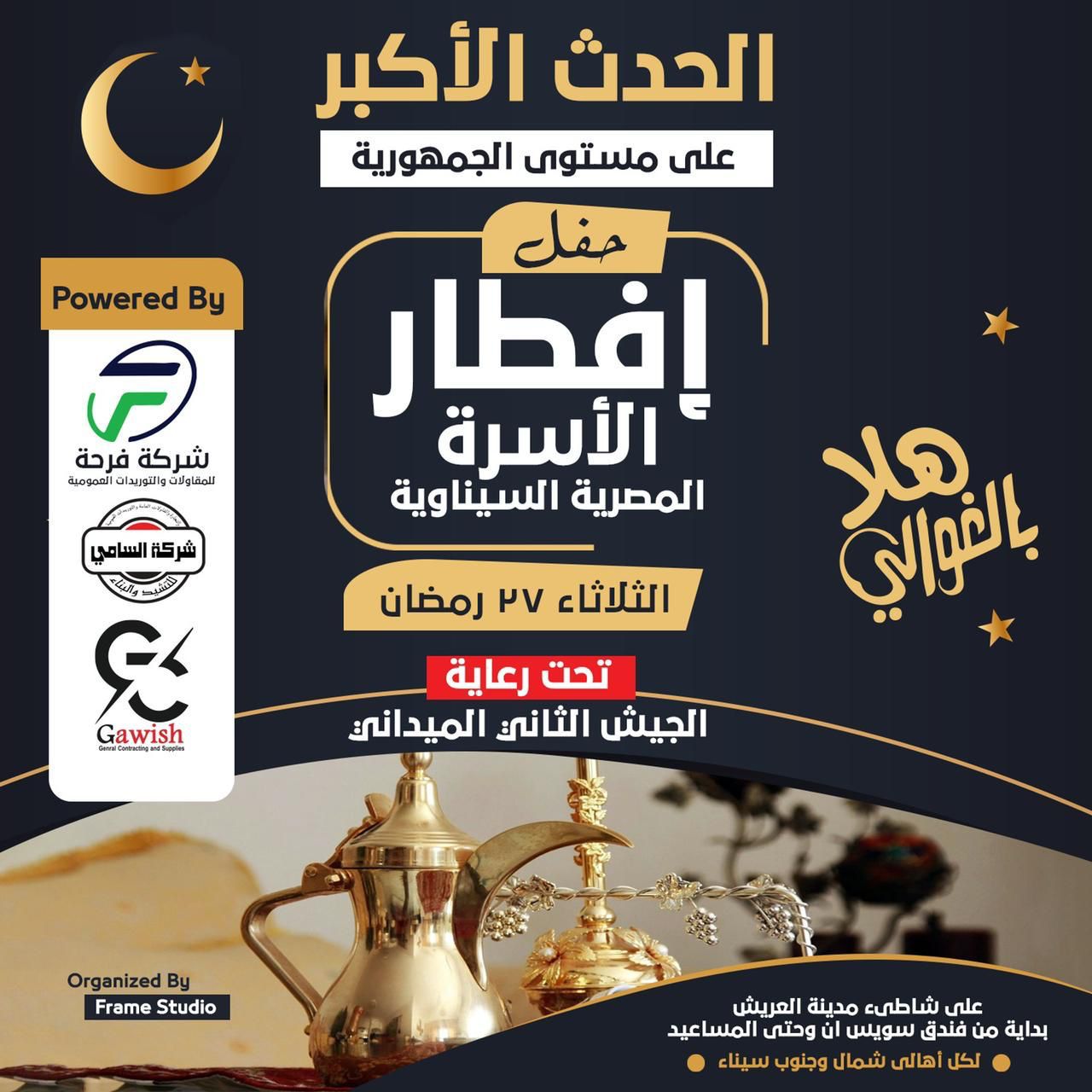 تحت رعاية قيادة #الجيش_الثاني_الميداني #ورجال_اعمال_شمال_سيناء منتظرينكم يوم الثلاثاء القادم ٢٠٢٣/٤/٢٧ علي شاطئ البحر بمدينة #العريش ابتداء من فندق #سويس_ان حتي #المساعيد