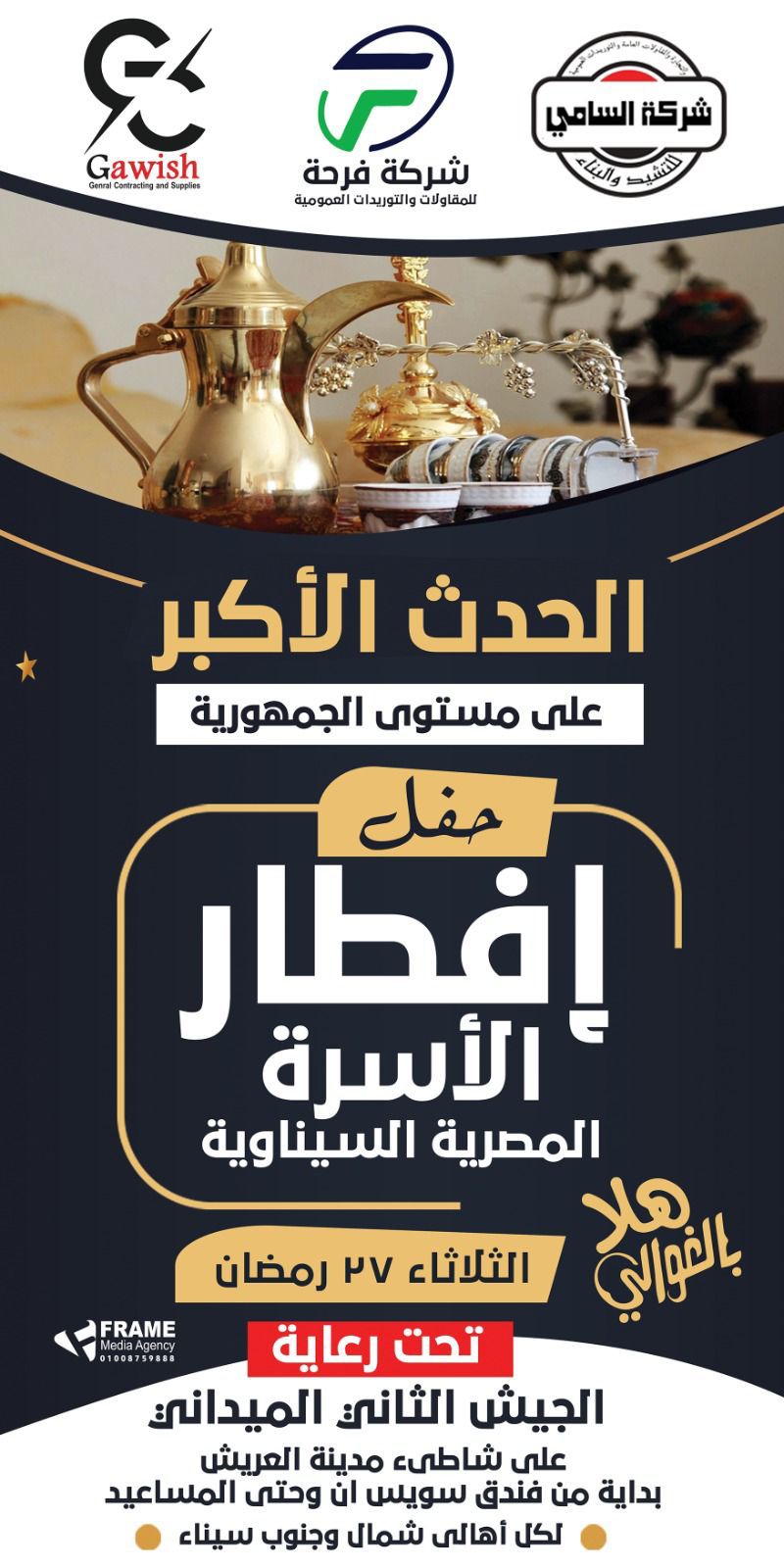 تحت رعاية قيادة #الجيش_الثاني_الميداني #ورجال_اعمال_شمال_سيناء منتظرينكم يوم الثلاثاء القادم ٢٠٢٣/٤/٢٧ علي شاطئ البحر بمدينة #العريش ابتداء من فندق #سويس_ان حتي #المساعيد