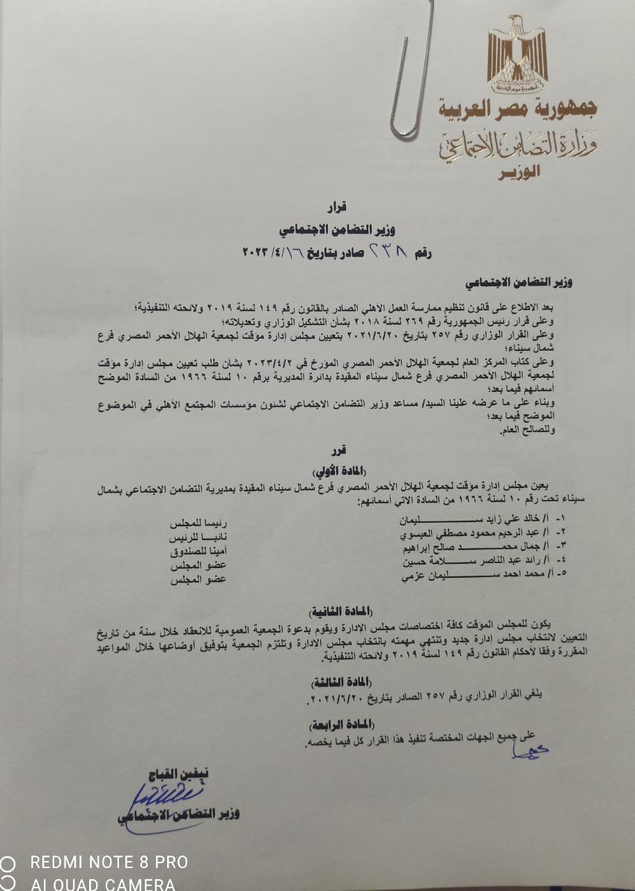 وكانت الدكتورة نيفين القباج، وزيرة التضامن الاجتماعي، قررت تعيين مجلس إدارة مؤقت لفرع جمعية الهلال الأحمر المصري بشمال سيناء والمقيدة بمديرية التضامن الاجتماعي بالمحافظة تحت رقم 10 لسنة 1966.