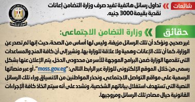 وأكدت الوزارة، أنه لا صحة للرسائل الهاتفية المتداولة والتي تفيد صرف وزارة التضامن إعانات نقدية بقيمة 3000 جنيه، وأن تلك الرسائل مزيفة، وليس لها أساس من الصحة، حيث إنها لم تصدر عن الوزارة، كما أن تلك الإعانات وهمية ولا علاقة للوزارة بها، مُشيرةً إلى أن كافة المنح والمساعدات التي تقدمها الوزارة ضمن البرامج الموجهة للأسر من محدودي الدخل، يتم الإعلان عنها بشكل رسمي من خلال الموقع الإلكتروني للوزارة عبر الرابط التالي: “moss.gov.eg”، أو عبر منصاتها الرسمية على مواقع التواصل الاجتماعي، مُحذرةً المواطنين من الانسياق وراء تلك الرسائل النصية التي تستهدف استغلال بياناتهم الشخصية، مُشددةً على أنه سيتم اتخاذ كافة الإجراءات القانونية حيال مصادر تلك الرسائل ومروجيها.