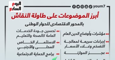 ونستعرض خلال الإنفوجراف التالى أبرز الموضوعات على طاولة النقاش بالمحور الاقتصادى للحوار الوطنى..