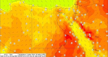 وبالنسبة لدرجات الحرارة، غدا الثلاثاء: القاهرة العظمى 34 درجة والصغرى 21 درجة، والإسكندرية العظمى 29 والصغرى 18 درجة، ومطروح العظمى 26 درجة والصغرى 17 درجة، وسوهاج العظمى 37 درجة والصغرى 21 درجة، وقنا العظمى 39 درجة والصغرى 21 درجة، وأسوان العظمى 39 درجة والصغرى 22 درجة .
