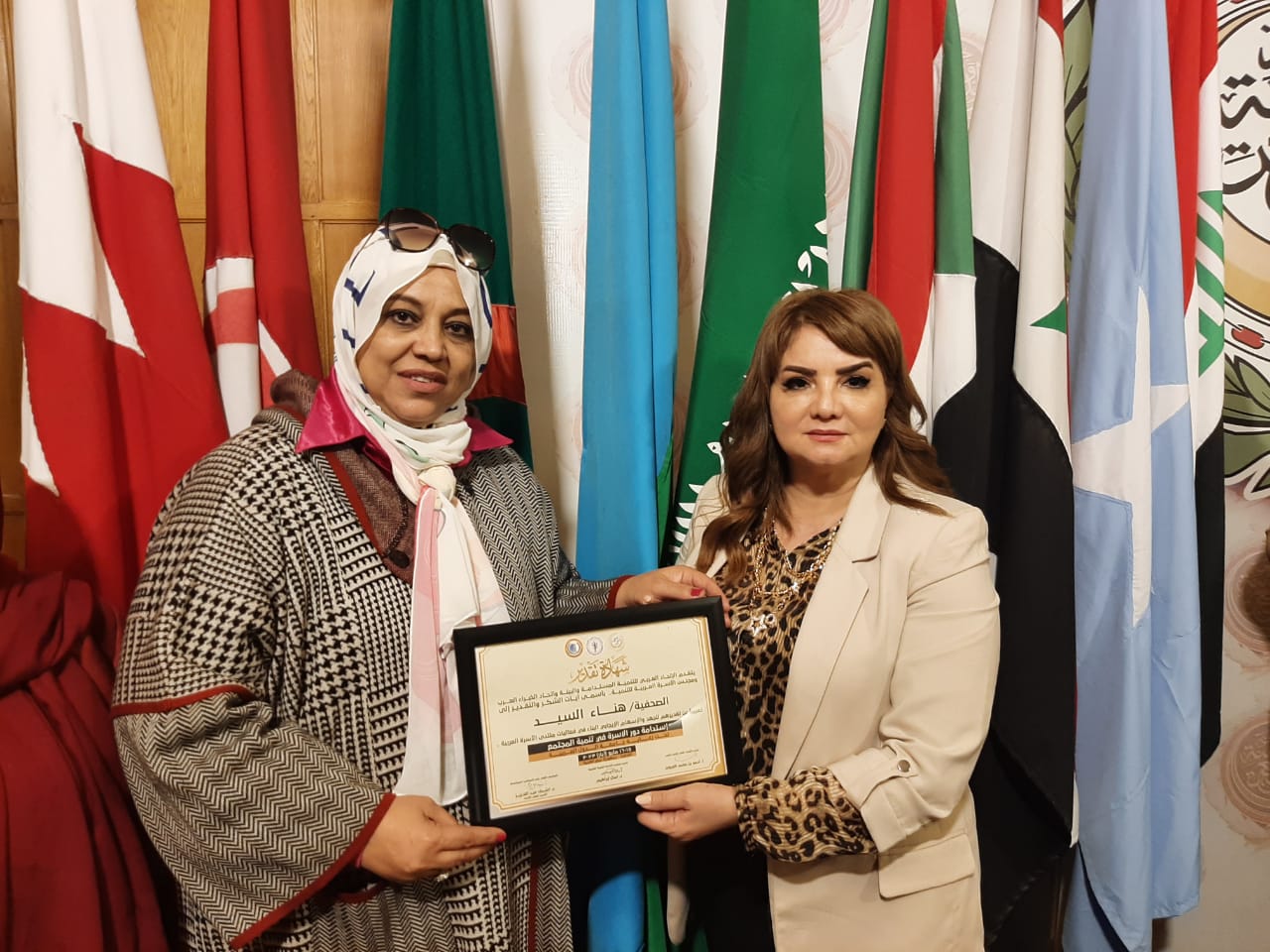 الزميله الاعلاميه هناء السيد تقديرا لجهودها ودعمها لقضايا المرأه والاسره العربية كما كرم المجلس عدد من والمتحدثين والمشاركين حيث أقيم المنتدى التول للاسره العربيه تحت رعايه الجامعه العربيه