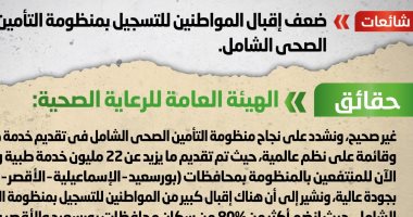 كشف المركز الإعلامي لمجلس الوزراء، أنه في ضوء ما تردد من أنباء بشأن ضعف إقبال المواطنين للتسجيل بمنظومة التأمين الصحي الشامل، تواصل المركز مع الهيئة العامة للرعاية الصحية، والتي نفت تلك الأنباء، مُؤكدةً أنه لا صحة لضعف إقبال المواطنين للتسجيل بمنظومة التأمين الصحي الشامل.