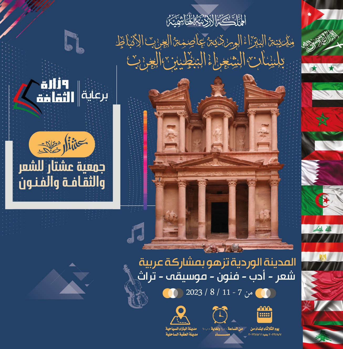 تنطلق فعاليات مهرجان البتراء على لسان الشعراء النبطيين العرب برعاية وزيرة الثقافه دكتورة هيفاء النجار وبالتعاون مع وزارة وهيئة السياحه الأردنية تنظيم جمعية عشتار للشعر والثقافه والفنون البرنامج يحتوي على الشعر النبطي والشعبي والفصيح والفن التشكيلي. ومعارض عسكريه ومحليه بمشاركة اكثر من خمسون شاعرا من الول العربيه ..السعوديه