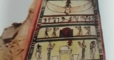 يعرض مومياء لكبش ملفوف بلفائف كتابية عليها رسوم لبعض الآليه من العصر اليوناني الروماني