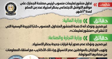 كشف المركز الإعلامي لمجلس الوزراء إنه فى ضوء ما تم تداوله من منشور تعليمات منسوب لرئيس مصلحة الجمارك على مواقع التواصل الاجتماعي بحظر استيراد عدد من السلع لمدة ٣ أشهر،تواصل المركز مع وزارة المالية، والتي نفت تلك الأنباء مُؤكدةً أنه لا صحة لمنشور التعليمات المنسوب لرئيس مصلحة الجمارك بحظر استيراد عدد من السلع لمدة 3 أشهر، وأنه لا صحة للمنشور المتداول، المنسوب كذبًا للجريدة الرسمية التي لا تنشر أي «منشور تعليمات».