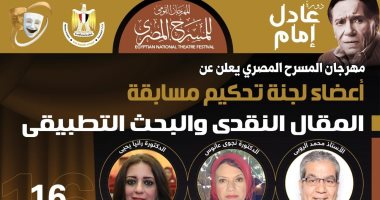 يعلن المهرجان القومي للمسرح المصري برئاسة الفنان محمد رياض عن أعضاء لجنة تحكيم المقال النقدي، والبحث التطبيقي في الدورة السادسة عشرة ( دورة عادل إمام ) التي ستنطلق خلال الفترة من 29 يوليو وحتي 14 أغسطس .