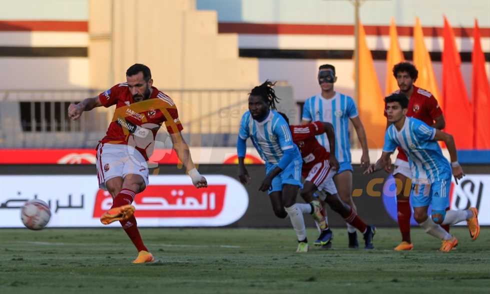 وحصل الأهلي على ركلة جزاء في الدقيقة 15 بعد عرضية من معلول لمست يد محمود طلعت مدافع الداخلية.